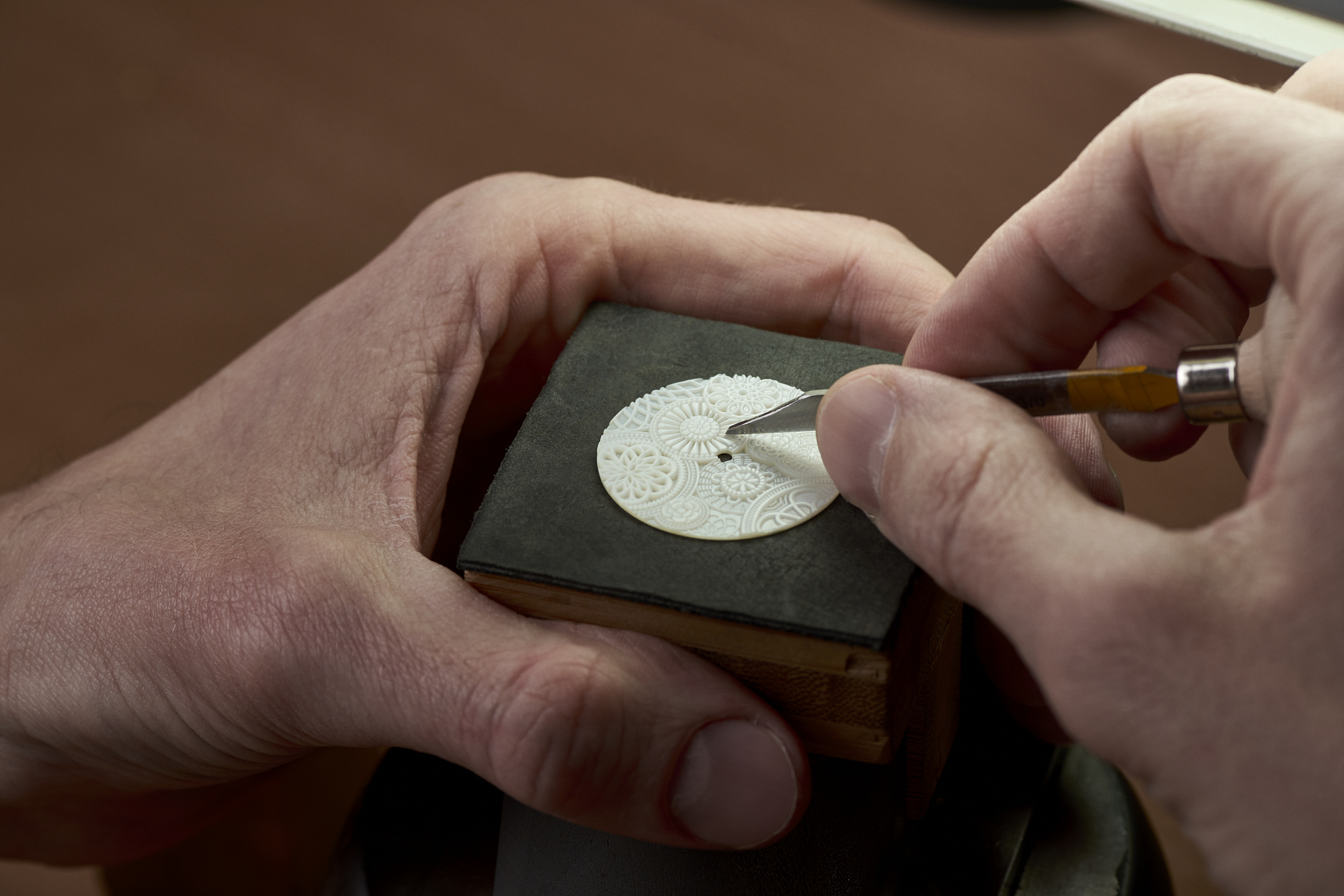 Engraving on mother-of-pearl on multiple layers; patterns echo the engraving on the movement