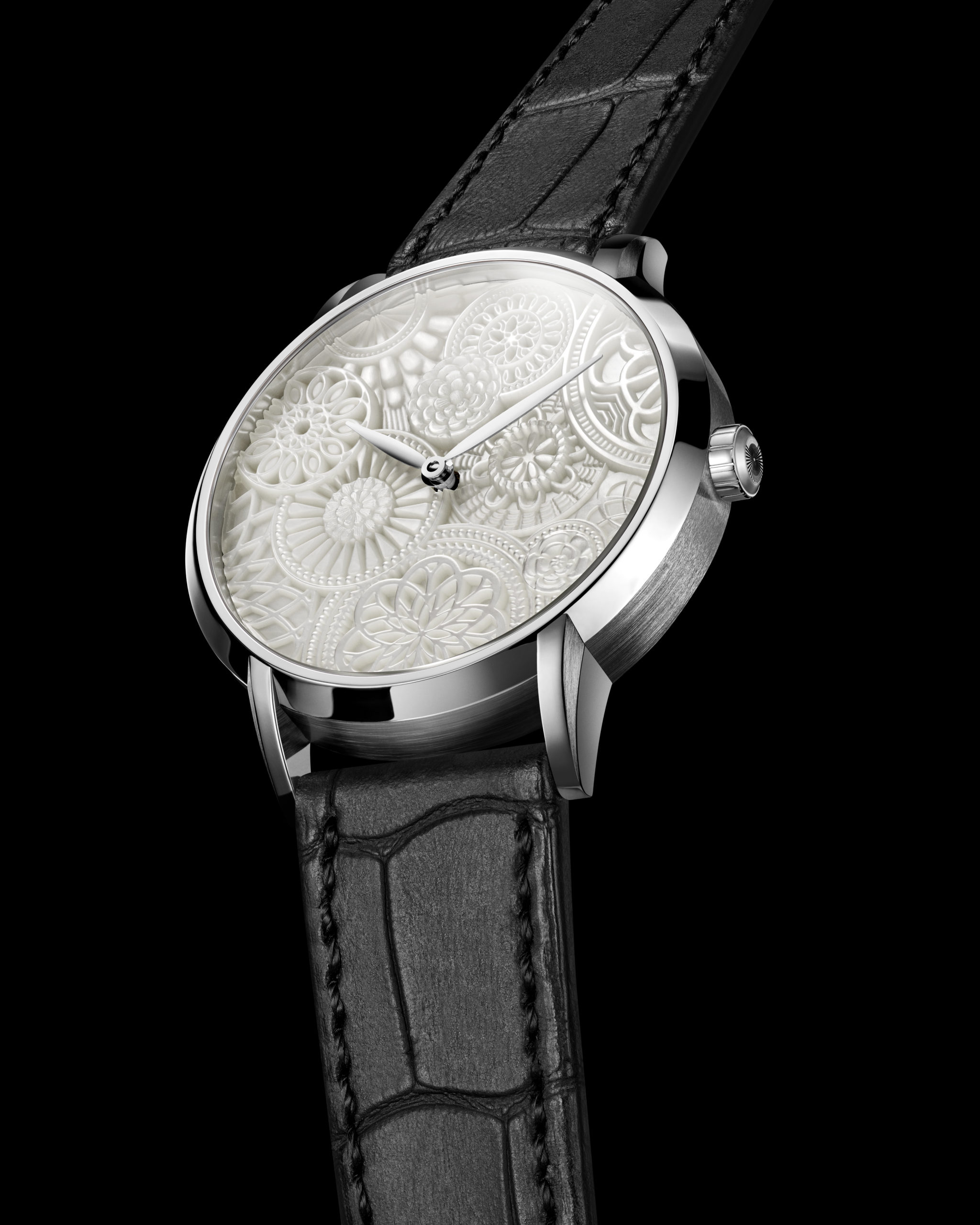 Ondes transcends its monochromatic appearance, harmonizing mechanics and art. The mother-of-pearl dial is engraved layer upon