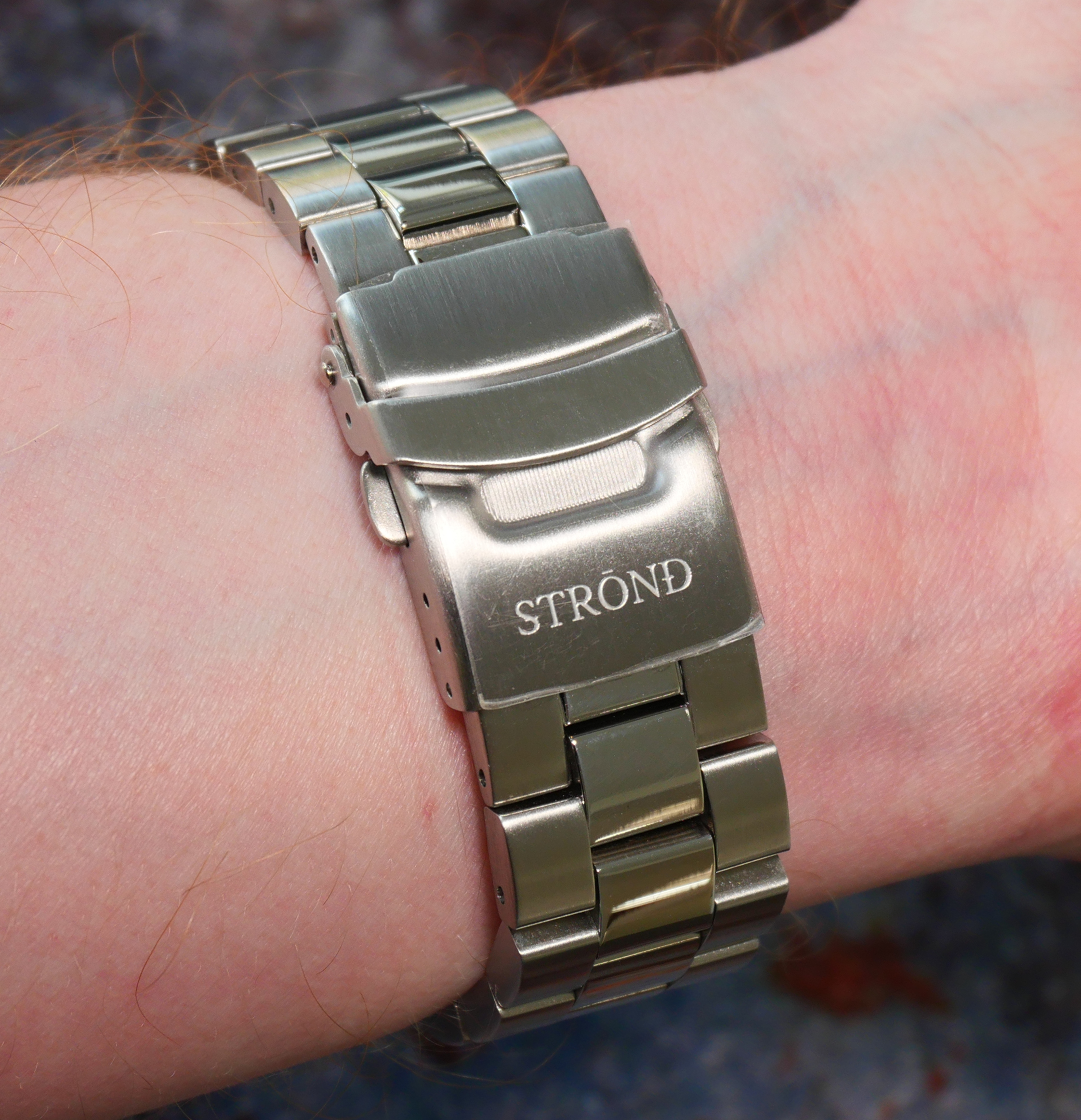 It is fastened with a folding clasp; the clasp is in brushed steel and has STROND engraved into it.