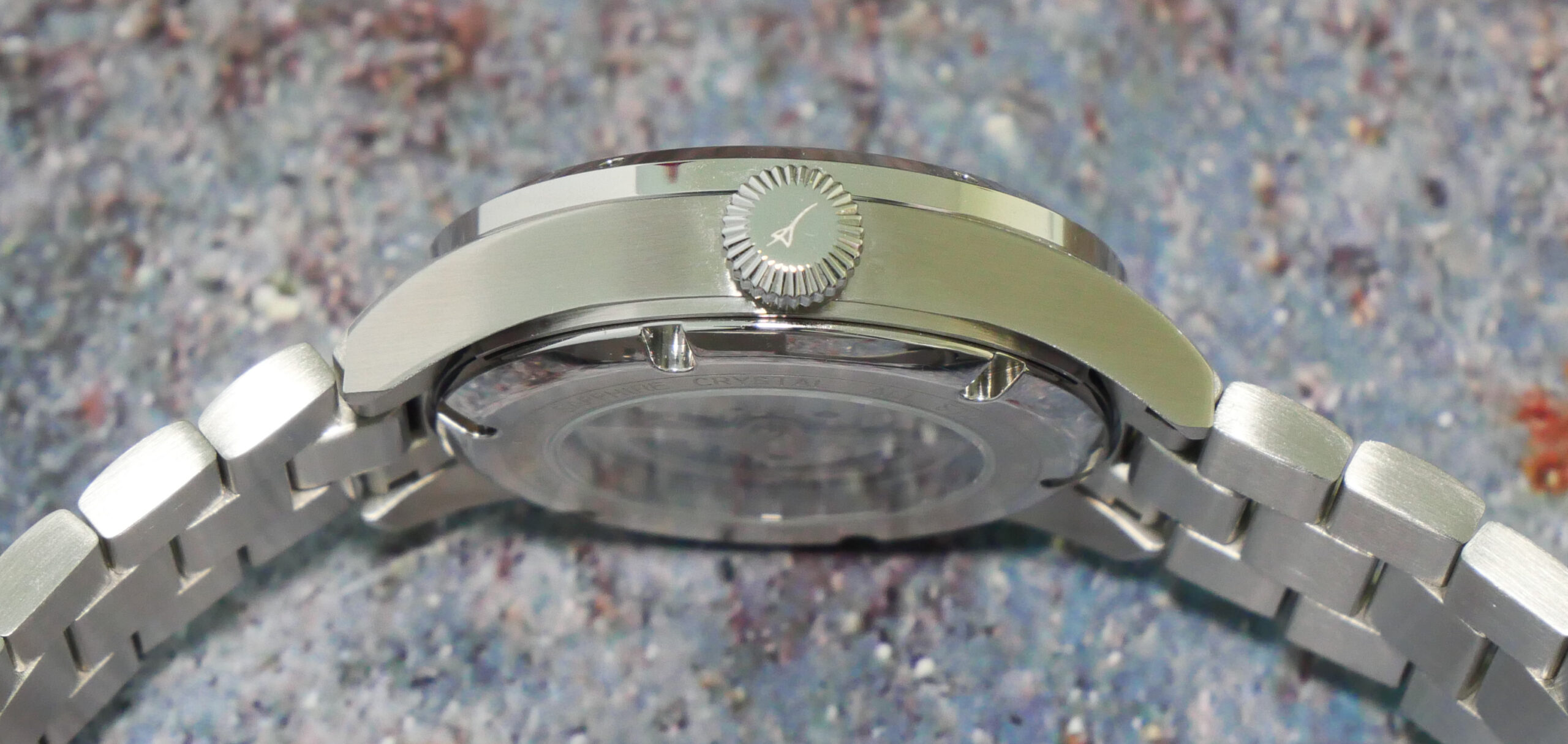 Flip the watch over and the central window of sapphire crystal shows off the automatic movement in the centre of a screw off polished steel case back. There is a small amount of thin Geneva style stripes in the centre and a few sandblasted areas. Â